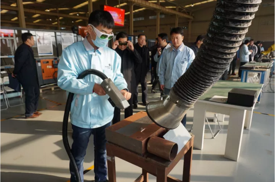 丁市長(zhǎng)佩戴了激光防護(hù)眼鏡,近距離參觀了英萊科技研發(fā)的激光清洗設(shè)備工作現(xiàn)場(chǎng)
