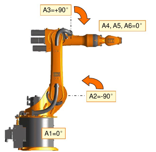 以KUKA為例,使用EMD對機器人進行零點校準。首先移動機器人各軸到達零點位置,如下圖所示: