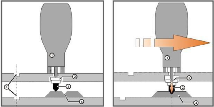 校準示意圖如下:選擇需要執(zhí)行零點校準的軸,在開始時使機器人軸回到零點位置,使對應(yīng)的凹槽處于同一直線上。然后按使能鍵,伺服上電后,按執(zhí)行鍵,機器人會自動進行零點校準,執(zhí)行校準程序時,機器人緩慢移動,當(dāng)探頭3準確到達零點凹槽4位置時,機器人提示校準完成,此時機器人停止移動,機器人該軸的零點實現(xiàn)校準。