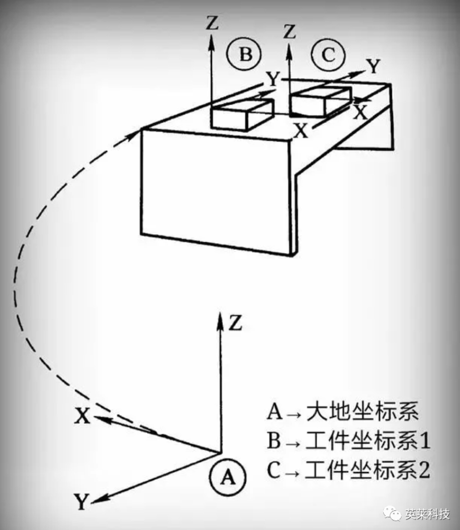 工件坐標(biāo)系:它定義工件相對于大地坐標(biāo)系(或其他坐標(biāo)系)的位置,如下圖所示。